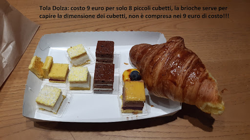Tre anni fa: Ci sono stato due mesi fa con mia moglie, quando era aperto da poco. Abbiamo preso un paio di cornetti e un cappuccino. Siccome i cornetti erano vuoti ci hanno proposto una farcitura sul momento, abbiamo ringraziato, ma quando li abbiamo mangiati, abbiamo dovuto attendere di mangiare metà brioche per vedere il condimento che era quasi invisibile. Se all'apertura sono stati così generosi, mi chiedo cosa accadrà in seguito. Non credo di aver mai messo una sola stella in una recensione, ma spero che serva da incentivo per migliorarsi. La pessima recensione è anche frutto del prezzo pagato, mediamente sopra la media. Peccato perchè il posto è carico e i prodotti ci sono sembrati artigianali. Auguro sinceramente al gestore di sapersi accattivare il cliente anche con quantità e prezzi adeguati. Aggiornamento 3 aprile 2021: Ero stato in questo locale tre anni fa, fu una pessima esperienza per la quale scrissi una adeguata recensione su Google, oggi sono tornato anche perché il proprietario aveva risposto alla mia, scrivendo che mi invitava a ripresentarmi per una seconda occasione. Per oggi ho quindi prenotato una magic box, ossia una scatola a sorpresa con garanzia di presenza di prodotti per un valore di almeno nove euro. Ho aperto la scatola direttamente nel bar, davanti al personale, per controllare subito la consistenza ed ho trovato solo otto piccolissimi cubetti di torta, ho quindi chiesto immediatamente i giustificativi al personale che ha dovuto ammettere che il costo reale dei prodotti presenti ammontava a 8 euro, pertanto oltre che a confermare che la pasticceria è tuttora incomprensibilmente cara, posso anche oggettivamente consigliare di non fare affidamento su questo bar pasticceria. Allego anche altre foto della stessa tipologia di magic box di pasticcerie concorrenti (ogni foto contiene prodotti per almeno nove euro, allo stesso costo di Tola Dolza). Oltretutto, a mio modesto parere, il gusto dei prodotti della concorrenza si distanzia in positivo da Tola Dolza, ancora più della quantità di cibo che si ha...