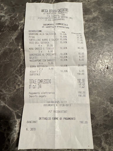 Sono stato in questa osteria con la mia famiglia in 5 persone e purtroppo abbiamo avuto un’esperienza decisamente negativa. Appena seduti al tavolo notiamo che delle posate erano sporche e, quando ci sono stati portati i piatti, anche due di questi erano sporchi, tant’è che ce li siamo fatti cambiare. Ordiniamo, 5 primi, 4 porzioni di gnocco e tigelle, 4 birre ichnusa e 2 bottiglie d’acqua. I primi, di cui pasta al ragù, gramigna con salsiccia e tortelloni burro e salvia, senza infamia e senza lode, niente di che insomma. Arrivano gnocco e tigelle, per 4 porzioni ci sono arrivati un totale di 10 gnocchi e 10 tigelle, due vassoi di affettato mediocre e scarso nella quantità, un porzioncina di pinzimonio e 2 piccole ciotoline di umido, nutella e una ciotolina di lardo di dubbia qualità visto il colore peculiare. Arriviamo al dolce, prendiamo 3 semifreddi al croccante, un mascarpone e una porzione di gelato. Se per quanto riguarda il gelato e il semifreddo il gusto era buono, questo non si può dire del mascarpone, che aveva una consistenza molto liquida e sapeva di cipolla, sintomi di una montatura sbagliata e conservazione a dir poco pessima (inutile dire che non è stato mangiato per evitare spiacevoli inconvenienti). Abbiamo chiamato il cameriere ed a seguito di lamentela ci siamo fatti cancellare dalla comanda questo dolce. NOTE SUL SERVIZIO: Ad inizio cena, mia moglie ha dovuto chiedere per ben 3 volte un piattino per la bimba piccola, che non è stato portato finché non si è alzata lei stessa ed è andata a chiederlo per una quarta volta ai camerieri, un ragazzo e due ragazze, tutti sui 20 anni. Quando ci sono state portate le birre, queste erano stappate e tenute per il collo della bottiglia, per poi essere consegnate prendendole da sopra, così da toccarle per bene nella parte dove passa il liquido prima di andare nel bicchiere, tutto molto igienico insomma. PASSIAMO AL CONTO Andiamo a pagare, ci troviamo davanti ad un conto di 190€, in cui alla fine ci è stato fatto pagare anche il mascarpone avariato (ce ne siamo accorti solo una volta rincasati) Al netto del costo delle altre ordinazioni, quello che ci ha lasciato basiti sono stati i 20€ a testa per il gnocco e tigelle. Facendo due conti veloci, con 20 euro ogni persona aveva a disposizione 2 tigelle piccole, 2 gnocchi fritti piccoli e companatico di scarsa qualità. Qui siamo ampiamente oltre il caro per un luogo con servizio al tavolo e pulizia oltremodo discutibile e qualità del cibo mediocre.