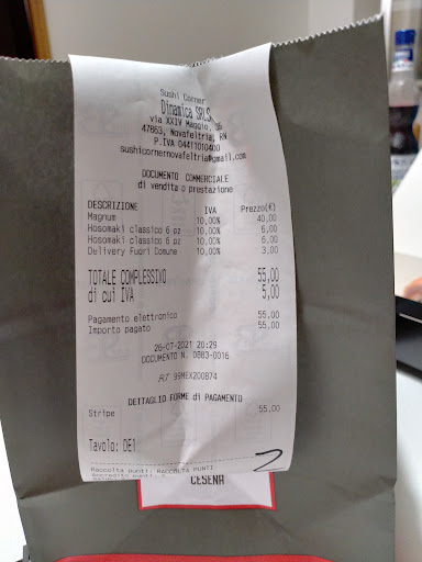 Read moreNonostante abiti a Roma, mi ritrovavo a casa dei miei nonni a Novafeltria, ed era da tempo che avevo adocchiato il Sushi Corner ma per un motivo o un altro non ci avevo mai mangiato. Devo dire che, nonostante sia alla carta, la qualità supera di gran lunga il prezzo che per me è più che giusto. Secondo me la qualità è superiore alla maggior parte dei ristoranti di Roma e di altre città che ho visitato. Sicuramente ci ritornerò per mangiare nei prossimi giorni di ferie che passerò nel Montefeltro. Aggiungo che il taglio e la qualità del pesce si avvicina molto a quella che ho assaggiato in alcuni ristoranti di lusso e non in Giappone. Continuate così! Vi consiglierò a tutti quelli che conosco e presto andrò ad assaggiare la qualità della cucina della vostra...