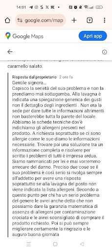 Mi permetto infine di ricordare che l’allergia non è un vezzo né una scelta, ma una condizione medica seria. Mi auguro che la titolare voglia informarsi seriamente, studiare a fondo la normativa vigente e formarsi con responsabilità, prima di continuare a gestire un’attività di somministrazione alimentare. Per la sicurezza di tutti, sarebbe auspicabile aggiornare la comunicazione interna e l’etichettatura dei prodotti in modo conforme alla...