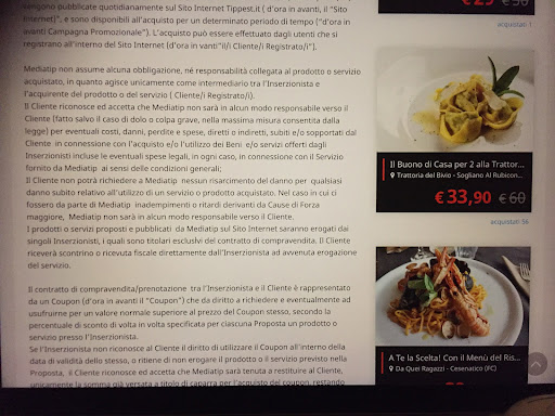 Davvero mi lusinga il fatto che su tante recensioni abbia trovato proprio nella mia lo stimolo di fare il suo primo intervento. Probabilmente è l’argomento fiscale che più le è interessato e comunque mi sono permesso solo perché in altri ristoranti lo scontrino mi è sempre stato fatto anche se con coupon Tippest. Ma la sua risposta mi ha incuriosito perché non avrei mai voluto “accusarla” di un qualcosa per cui lei ha ragione e così mi sono informato meglio tramite Mediatip come da lei indicato. Come può vedere nella foto allegata (paragrafo centrale ultime 3-4 righe)…….l’inserzionista deve emettere scontrino al cliente. L’inserzionista è lei e il...