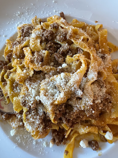 Read moreLe maggior parte delle portate ordinate sono piaciute: pasta al forno, tortellini in brodo, passatelli in brodo, cotoletta alla bolognese. La pasta al forno, tuttavia, era in quantità piuttosto scarsa, è finita in pochi bocconi. Anche la cotoletta alla bolognese non è delle più grandi (ma, a differenza del piatto precedente, non si può definire piccola). Quando vado in un ristorante, infatti, non mi piace solo "assaggiare", ma anche mangiare! Sulla grigliata di carne coloro che l'hanno mangiata hanno convenuto sul fatto che fosse buona tranne che per la pancetta, giudicata negativamente. Il vino della casa è buono e forte, considerato il suo prezzo. Attenzione comunque a non esagerare, perché del vino economico in grande quantità se ne risente. Il personale è gentile, sono dotati di seggioloni per i più piccoli, e il locale si è riempito velocemente, denotando una folta e abituale clientela, il che solitamente è un buon segno. C'è spazio per camminare, il che aiuta molto i più vivaci bimbi piccoli tra una portata e l'altra, com'era nel nostro caso. Curiosità: eravamo l'unico tavolo a cui non è stato servito parte del coperto (pane e grissini) fino a dopo le prime portate, al che abbiamo risolto chiedendolo al personale di sala. Nel complesso l'esperienza è stata positiva e rilassante, direi il classico "buono ma non...