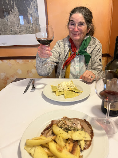 Amazing pranzo at this classic trattoria just off the Piazza della Repubblica, we had a wonderful antipasti of caciotta locale fusa con verdure, a typical cheese of the region melted with greens that was perfect with a slice of bread, then a beautiful ravioli all’ortica, a ravioli stuffed with nettles and the caciotta, so tender and fresh, and also the porchetta marchigiana e patate, thinly sliced roast pork with oven roasted potatoes seasoned with rosemary and fennel—incredibly flavorful and delicious. They recommended a perfect local red sangiovese that was a great match, and the atmosphere was like eating at home. We finished with a torta cioccolata con frutta de bosco, a warm chocolate tort with berries and an espresso! On a very festive holiday, Liberation Day in Italy, the service was perfect, attentive and timely even with a packed house. We highly recommend this reasonably priced restaurant if you have the good fortune to be in this...