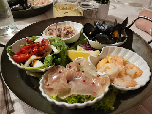 Partiamo dal servizio, estremamente lento nonostante ci fossero solo 2 tavoli oltre al nostro. Menu molto povero di selezione. Antipasto terra servito con salumi molto vecchi e per niente freschi, il pane di accompagnamento era duro come sassi. Impepata di cozze pessima, pesce veramente di bassa qualita, cosi come i fritti. I primi sono porzioni da bambini e uno si aspetterebbe piccola porzione equivale a ottima qualità...beh non qui. Risotto ai funghi insipido, funghi scongelati annacquati...oltre ad aver aspettato 1h e mezza dopo l antipasto per averlo. Dopo un altra mezz ora arriva la carne, tagliata di manzo...fredda...non si poteva certo definire manzo, le bistecche sottocosto dei supermercati son piu saporite. Se prendete menù e non ordinate alla carta, per il dessert avete una ampissima scelta di dolci...profitterol (1 sola palla) o tiramisu servito in coppe di plastica dei gelati del supermercato. Nulla di piu. Amari incredibilmente serviti dentro bicchieri di plastica. Sconsiglio...