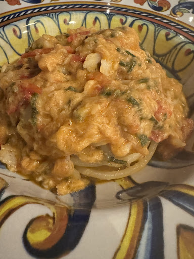 Primo, delle tagliatelle alla Nassa: la prima cosa che vi colpirà è l'odore, un odore di "io sono il piatto che cerchi da tanto tempo", un piatto completo, abbondante, studiato e pieno di gusti, vi consiglio un vino per pulirvi il palato tra porzione e porzione perché merita la vostra attenzione. La bisque vi porterà a fare una scarpetta obbligatoria, in sala vi avvertiranno anche che qualora doveste non farla vi sarà una multa (ovviamente un modo simpatico per invitare i commensali a godersi il pasto). Le consistenze sono perfette, equilibrate e tutte con una propria identità, se assaporate il crudo sentirete un'avvolgente esperienza, il cotto un deciso abbraccio, nota di merito va alla texture e cottura delle tagliatelle, sentirete in bocca ogni millimetro di quella pasta che tanto amerete. Ho notato la pulizia minuziosa di pomodori, salicornia e non per ultimi i gamberi, che fin troppo spesso vengono puliti bonariamente, questo dettaglio mi fa capire quanto in cucina vi sia una cura e una grande preparazione.
