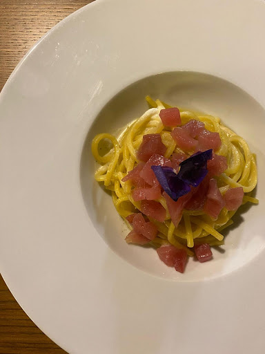 Prima volta per un fortuito sbaglio convinti di trovare qualcosa che non esiste più..pur mantenendo la stessa gestione. Open space arioso, minimal con ampi spazi arredati con gusto, servizio impeccabile e per nulla invasivo, ottima la musica. Siamo qui per mangiarare e questo poi si rivelerà qualcosa di estremamente interessante in quanto, per la prima volta, scusate il giro di parole siamo stati costretti dalle papille gustative impazzite dai sapori a fermarci al primo...perché ci sembrava giusto così ....per troppo piacere dei gusti provati. La "Calamarata" con ricciola ed emulsione di limone è stata un'esperienza bellissima.. arriva il limone non copre i pomodori di due qualità pazzesche, e poi la regina del mare una sinfonia impetuosa ma allo stesso tempo lieve.. Genovese con emulsione di parmigiana... Fantastica! Vi dico solo che mia madre ...sarebbe corsa in cucina a chiedere comm s'fá! Molto grati per questo...