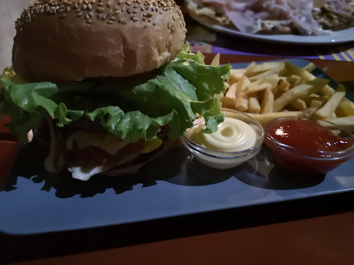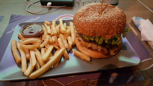 Read moreArriviamo io e i miei amici al pub che ci era stato consigliato; la struttura è ben visibile perché è molto grande e verniciata di un bel viola con disegnato un panino gigante in stile moderno. Chi accolgono i ragazzi della sala senza aspettare molto. Il bancone è molto particolare perché ha una spillatrice in vista tutta in rame che ricorda le vere spillerie di un tempo. Volevo vedere la partita e mi hanno accomodato davanti ad un mega schermo che mi sembrava di essere a bordo campo. Ordino un hamburger, ma siccome sono un po’ particolare, gli ho fatto aggiungere e togliere alcuni ingredienti. Praticamente mi hanno fatto un panino su misura. Una buona birra e finito di mangiare sento che fuori giocano a biliardino (calcio balilla) che io adoro. Non me ne sono accorto prima perché non mi sono nemmeno reso conto di quante sale abbia. Ci sono anche i tavoli fuori su un pratino verde per chi volesse fumare. Per quello che abbiamo mangiato non posso neanche lamentarmi sul prezzo. Ci...