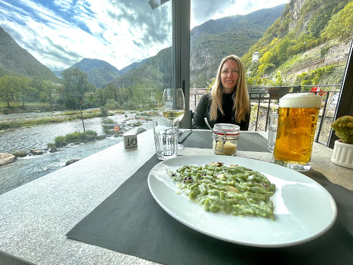 Read moreStopped here on route to Trento. Beautiful view of river and mountains. No pizza at lunch but delicious food. Guessed at the food (our Italian is not great) and had a brilliant lunch. Pillows of salty doughnut style 'bread' with slices of meat, delicious arancini, pasta with ragu and burrata ravioli. All big portions (we were stuffed) and really good. The place was busy and the staff...