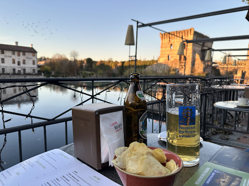 Read moreIl mio fidanzato ed io siamo stati in questo bar/ristorante per l'ora dell'aperitivo dopo un pomeriggio passato al parco Sigurtà. Ho scelto una coppa di gelato e il mio fidanzato un'acqua tonica e un calice di vino, che ha poi richiesto altre 2 volte ed anche io ho richiesto un'altra acqua tonica, per un totale di 2 acqua tonica, 3 calici di vino e una coppa di gelato. Il costo totale è stato di 25€. Non mi sto lamentando del prezzo, ne tantomeno del servizio perché per il posto, che dà direttamente sul fiume, è da "fighetti", mi lamento del fatto che chi mi ha fatto il conto alla cassa mi ha fatto passare per scema, ho richiesto lo scontrino perché ne avevo bisogno, prima ha fatto finta di cercare nel cestino, poi mi ha accusato di averlo fatto cadere a terra, ovviamente non era vero, allora ha cercato nuovamente nel cestino, se fossi rimasta lì 20 minuti avrebbe continuato a cercare nel cestino e a terra pur di non fare PER LA PRIMA VOLTA il mio scontrino. Lascio passare 2 caffè, o 2 aperitivi per un massimo di 10€ ma 25€ anche no!! Ho in programma di tornare al parco e a Valeggio sul Mincio ma sicuramente non...