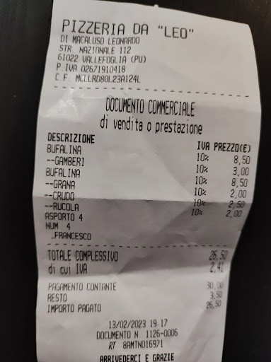 Read morePizza buonissima impasto leggero e digeribile Locale molto rinnovato e molto elegante Titolare molto simpatico e soprattutto molto gentile sempre pronto ad offrirti amari a fine pasto. Leonardo persona amata da moltissimi clienti si vede proprio che si siede con i clienti e nessuno va via senza che nessuno lo saluti. Che dire Proprietario = Amico splendida persona. Personale educatissimo molto veloce e soprattutto pronto per soddisfare ogni richiesta. Molte pizze con molte birre, e poi i prezzi sono molto convenienti paragonando le varie pizzerie della zona. Nulla da dire da Leo si va per mangiare per stare in compagnia e per stare bene. Grazie Leo e al...