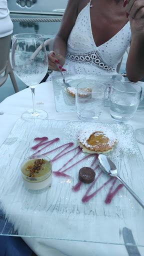 En ce qui concerne le repas: un menu de 2 entrées, 2 primos, 1 secundo, 2 desserts.... J'ai été déçue du début à la fin. Je pourrais simplement dire que ce n'est pas mon genre de cuisine, si cela avait été cuisiné correctement. Mais tout était trop cuit, sec, et enrobé de pain, pâte feuilletée, brisée froides et molles. Comme si tout avait été (mal) préparé à l'avance et réchauffé si besoin. Le poisson du plat principal était (heureusement) la seule chose pas trop cuite. Langoustine sèches, coquilles St Jacques du caoutchouc.... Et le tout baignant dans des sauces au goût multiples à base de chou-fleur. Le dessert, j'y ai trempé ma cuillère dans les 2 et.... c'est tout. Trop sucré, une mousse au chocolat granuleuse, et ce qu'il y avait dessous.... Pas meilleur. Seul le tiramisu avait une allure originale et je donne un point pour cette présentation. Il était mangeable, mais bon, j'espérais mieux.