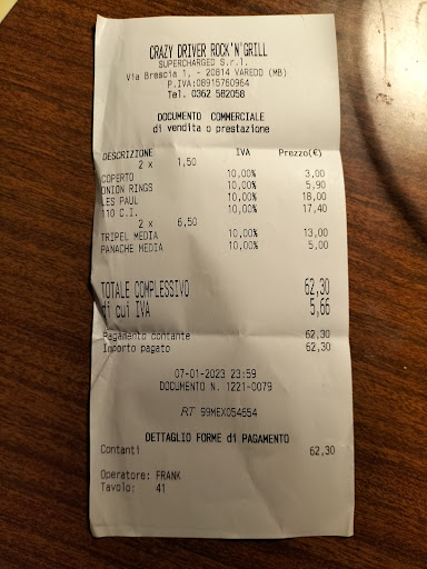 Read moreInsieme a un amico sono andato in questo locale a Varedo (MB) per mangiare e ascoltare musica dal vivo, confidando nel "brand" Crazy Driver che non mi ha mai deluso nel locale di Inverigo (CO). L'esperienza non è stata positiva in tutte le sue parti. L'ambiente è "ruspante e genuino" come piace a me, l'arredamento super-interessante, la qualità di birre e (soprattutto) dei piatti elevata, i prezzi in linea con quelli di tanti altri locali. Cosa non ha funzionato? Il servizio, troppo troppo lento. Forse avremo trovato il locale in una serata storta, ma aspettare oltre 75 minuti da quando ci si siede al tavolo a quando arrivano i piatti per mangiare è veramente troppo, fa "passare la voglia". L'impressione è che l'organizzazione dello staff del locale - cortese e non certo pigro - non sia al meglio: non si capisce bene chi "diriga l'orchestra" e quale siano i ruoli associati a ogni figura. Siamo arrivati senza prenotazione e ci è stato "trovato" subito un tavolo (benissimo, bravi!), ma nessuno è venuto a prendere gli ordini almeno per le bevande in 20 minuti e in seguito si è "persa" l'ordinazione di una birra (mai arrivata ma elencata tra quelle da pagare, l'abbiamo fatta rimuovere in cassa); quando poi siamo arrivati per pagare in cassa non c'era nessuno perché il cassiere era a fare i caffè e gli amari. Quindi, che dire? Speriamo sia stata solo un'occasione sottotono. Cibo comunque ottimo: onion rings squisiti, l'hamburger 110 CI del mio amico metteva l'acquolina in bocca al solo vederlo e il mio tris di carni alla griglia (Les Paul) era delizioso, con patatine di contorno fritte al punto giusto. Ho chiesto del pane di accompagnamento ma non è...