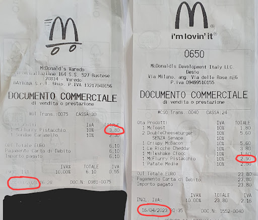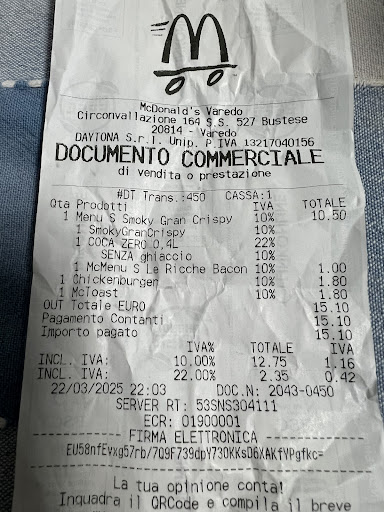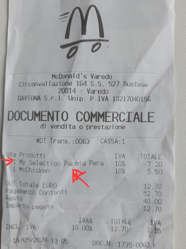 EDIT: 19/05/2024 Sarò sfortunata...oggi al McDrive ordiniamo 1 McChicken e 1 MySelection Parmigiano Pera (come si può vedere dalla foto dello scontrino). Già la ragazza che ha preso l'ordine voleva prenotarci un menù (non ho mai chiesto un menu) perché ci ha chiesto che bibita volevamo... poi ritiriamo l'ordine, e altrettanto "sfortunatamente" non pensiamo di verificare al momento. Arriviamo a casa e al posto del MySelection Parmigiano Pera vedo un MySelection Chicken Pecorino. Il tutto si può vedere dalle foto. Tutto sommato, confermo che il pollo è sempre ottimo, però, se ordino una cosa, non me ne consegni un'altra.