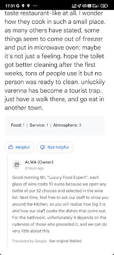 many wines are good, be prepared to pay 10 euros per glass, which might be worth it, if you get someone to suggest you the right one. wouldn't wish you to try the food, the location makes the price 2x/3x what's worth, and some of the food doesn't taste restaurant-like at all. I wonder how they cook in such a small place. as many others have stated, some things seem to come out of freezer and put in microwave oven: maybe it's not just a feeling. hope the toilet got better cleaning after the first weeks, tons of people use it but no person was ready to clean. unluckily varenna has become a tourist trap. just have a walk there, and go eat in another town.