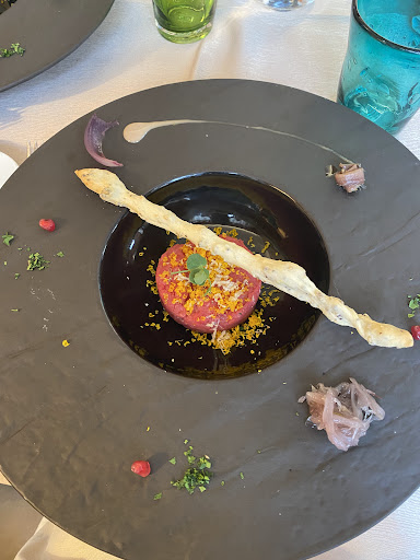 Read moreLocation dall'aspetto elegante, con due sale distinte. Possibilità di optare per menù proposti dallo chef o scegliere à la carte. Quest'ultima la nostra scelta: tartare di manzo con rosso d'uovo come antipasto, pappardelle integrali al cinghiale (davvero buone) come primo e come secondo filetto di manzo bavarese con carciofo (avrei apprezzato di più qualche altro contorno - in compenso la carne era morbidissima e cotta al punto giusto) e veli di manzo con insalata di carciofi; per concludere uno sfizioso goloso (semifreddo al cioccolato con crema al caramello, passion fruit e crumble alle nocciole) molto apprezzato e una scelta di formaggi. Nel complesso, per quanto mi riguarda, buona materia prima e prezzi proporzionati a quest'ultima (direi un po' sopra la media). Personale cordiale, anche se non proprio attento al dettaglio: vino versato una sola volta dal personale della sala, idem l'acqua, piatti terminati lasciati sul tavolo per troppo tempo e all'uscita, giacche consegnate come vengono consegnate in un guardaroba di un cinema (in certe location usualmente si aiuta il cliente nell'indossare il capo). Da ultimo, ma che sarebbe stato da inserire all'inizio, all'arrivo siamo stati accolti da una rissa scoppiata da degli avventori di un matrimonio: fatto che non dovrebbe capitare, nemmeno quando si alza un po' il gomito e che tuttalpiù andava risolta immediatamente dai gestori per evitare...
