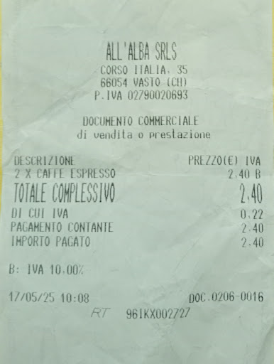 Siamo stati qui il 17-05-25 in visita al centro storico di Vasto e appena parcheggiata l'auto abbiamo deciso di prendere un caffè. Prima di tutto siamo andati in bagno risultati molto puliti e poi scambiato alcune chiacchiere con le simpaticissime signore al bar soprattutto perchè non abbiamo mai visto le porzioni di cornetto a metà. Ci hanno spiegato che dividono anche il cornetto in due così ogni cliente può assaggiare più gusti o addirittura prenderne solo metà senza rinunciare al peccatuccio di gola. Ben fatto. Noi abbiamo preso un'ottimo caffè e premiamo soprattutto per la simpatia delle ragazze. Ha tavoli all'esterno ma protetti perchè...
