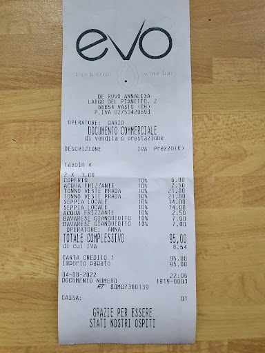 Read moreHo cenato la prima volta in questo ristorante due anni fa e da allora è diventato il mio posto del cuore. La location all'interno e' elegante, raffinata e ricercata negli arredi e nelle suppellettili. Nelle serate estive è possibile cenare all' esterno, in una suggestiva piazzetta del centro storico cittadino , abbellita ancor di più dalla titolare con arredi moderni e di gusto.Il ristorante Evo è una location irrinunciabile per gli amanti del pesce, soprattutto se crudo (i crudi sono talmente freschi che si sciolgono in bocca). I piatti sono preparati con ingredienti freschissimi dalle mani d'oro (frutto di preparazione, esperienza, studio e lavoro) dello chef Domenico Ginevrino, i sapori sono equilibratissimi e la presentazione e' frutto di studio, buon gusto e maestria...a quando la prima stella?! Il servizio è impeccabile e il personale e' accogliente, professionale, attento alle esigenze del cliente e sempre sorridente. La titolare , Annalisa, ti conduce dal primo all' ultimo minuto in un meraviglioso viaggio fatto di sapori, odori e colori. Ti prende per mano e da perfetta padrona di casa, ti guida con cordialita' , professionalita' , simpatia ed eleganza tra le mura di questo raro gioiello che e' Evo..la sua prima e preziosa. Un luogo ideale per chi e' alla ricerca di sapori autentici e raffinati....
