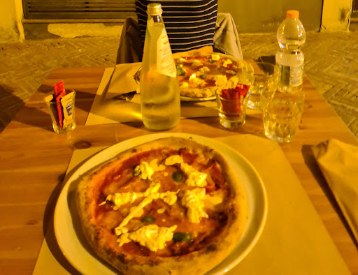 Eravamo in due (io e mia figlia). Era la nostra prima volta a Vasto e abbiamo trovato il posto per caso, mentre cercavamo dove cenare. Appena entrati, ci accoglie Giuseppe. Persona molto cortese e piacevole. Ci chiede se vogliamo accomodarci all'interno oppure all'esterno, e scegliamo di stare fuori. Sempre sorridente e apparentemente rilassato (lo sottolineo perché, a volte si trovano camerieri "musoni, costretti ai lavori forzati"), ci porta il menù. Io scelgo una PIAZZA CAPRIOLI, mentre mia figlia, ordina una BUFALA (nel caso non fosse chiaro, si tratta di due pizze). Nel menù non vedo traccia di patatine fritte, quindi chiedo se le hanno. Mi risponde che non le fanno loro, ma si appoggiano ad un locale adiacente (alla disponibilità, si aggiunge la flessibilità). Da bere invece, ordiniamo solo dell'acqua. Poco dopo arrivano pizze e patatine. Signori... che spettacolo!! I sapori, la consistenza, il grado si cottura, gli ingredienti... Roba che, se non avessi ordinato anche le patatine (perfette anche loro, e servite dentro due "ciotole"), ne avrei mangiate due!!! Una pizza lavorata e cotta da un mago! Mi informo sul nome del pizzaiolo (Luca). Abbiamo speso 36€ (compresa un'ulteriore bottiglia di acqua che abbiamo portato via). Morale; chi non c'è mai stato, deve provare. A chi invece conosce il posto, non ho nulla da spiegare! Bravi!...