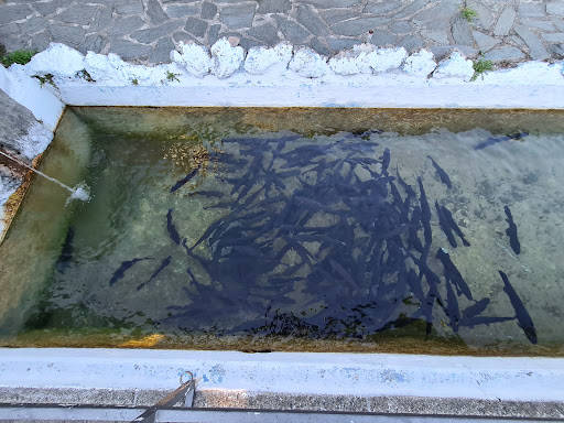 A very green place to have lunch at on a Sunday. The staff is very friendly, the atmosphere is great. We had a table outside, surrounded by fish, flowers and statues. We got an antipasto to share and different fish. I took a “glass of white wine“( as it was stated in the menu) and it appeared to be Gewurtztraminer - my favorite wine, so I was happy :) we also got some pieces of pizza kinda, as a welcome- which was very nice. The fish was a bit dry, but overall i would come back to this...
