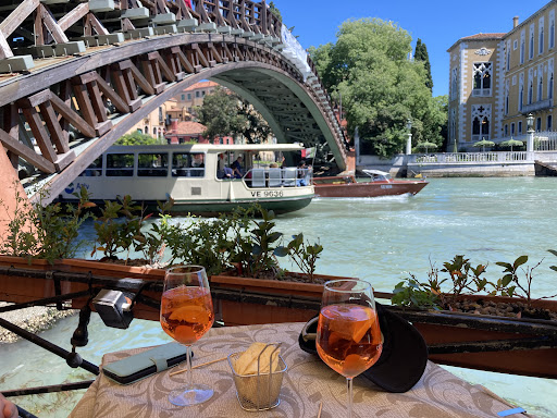 This is a very sweet bar on the very edge of the grand canal at Accademia. We were staying nearby and spotted the bar on the way home from a long day of exploring. One or two gondoliers were finishing off their afternoon with a couple of beers at the bar so we thought It must be a decent watering hole. The staff were very friendly – even turning a blind eye to the arancino slushy our daughter had smuggled in and was hiding under the table. We ordered Campari and Aperol Spritzes and they arrived with a very generous helping of salty snacks. The Spritzes were wonderfully cool and refreshing. The prices were reasonable and the view was marred only by the fact that the Accademia bridge is being restored and is currently swathed in scaffolding (August 2018). The following night we attempted to have the same experience at the Beccafico bar (opposite Bar Foscarini on the same side of the grand canal). Beccafico was much more expensive, not very friendly and the view much the same; so if you have a choice, we’d recommend...