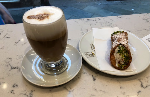 What a wonderful place to drink your coffee in the morning! First of all, I really liked this place because it had a wide variety of cakes and pastry products that you could choose from. They were very nicely arranged as well. I had a really big cafe latte which impressed me because in many places the coffee is not as big. I also had a ricotta and pistacchio cannoli, which was really rich in flavour and very consistent. You cannot really sit here because there are only counters where you can serve your products, but no chairs. Me and my friends served our coffee and pastry products near the windows and it was funny that people who were passing on that street were looking at us while we were eating. The staff was really friendly to us. The coffee took a while to be prepared but there was only one person taking care of coffee and the shop was really crowded at that time. Overall, I recommend this place. It it perfect for a breakfast or a...