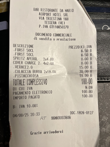 Bad experience here. Staff is friendly, but robotic. Like others, at the end of our vacation, tired, just want one more nice meal. Unfortunately, we didn’t have any luck here. My wife’s spaghetti/ carbonara was average- she picked out all of the bacon- since it was basically raw/ way undercooked. Our waiter put in the wrong pizza, even though I clearly showed him which one that he confirmed with the correct pronunciation. So, after talking with a co worker or the manager- hard to tell- the waiter says they can make correct pizza. Sorta making me feel like they’re doing me a favor. Of course, after 20 minutes and my wife completely done with her pasta- here comes the correct pizza, crust is burnt to a crisp- obviously rushed the order. We’re 45 minutes in, probably not going to ask for a redo at this point. Most establishments would comp the meal. Not the case here- Another irritating thing is they have a 3 euro/person cover charge for the privilege of sitting through the...