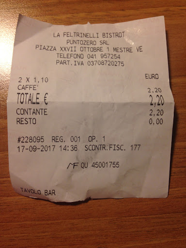 Read moreSituato all'ultimo piano del "Centro Commerciale Le Barche", in centro a Mestre, il Feltrinelli Bistrot è un posto tranquillo in cui fare colazione, mangiare uno spuntino o pranzare, con la possibilità di sedersi per consultare libri, studiare o lavorare con il proprio laptop: ci sono due punti con prese di corrente a completa disposizione dei clienti.