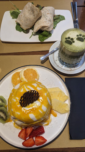 We chose the fluffy pancakes and a chicken wrap and were stunned with the texture and flavour of both. The chicken wrap is very balanced, has a lot of meat and veggies that compliment the taste. The pancakes had the same taste and flavour of fluffy pancakes I had in Japan - so compliments to the kitchen staff for managing to getting this right. It's served with fresh fruit and enough sauce to satisfy everyone's saucy needs!