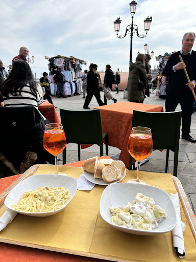 Read moreWell it’s a nice surprise that by the sea and with the view you can get such a low prices for Venice. We ordered spaghetti carbonara and tortellini, we received our order right away (within 5 minutes) which is kind of strange. Given the pasta was really warm. It made us suspicious that it was pre made. Carbonara was ok, but kinda tasteless. Pancetta could be a bit more done. Aperol was tasty. With our meal we got some bread, but due to the big amount of pigeons on the square our bread was “stolen”. The waiter was upset with us for feeding the pigeon, but honestly we weren’t the...