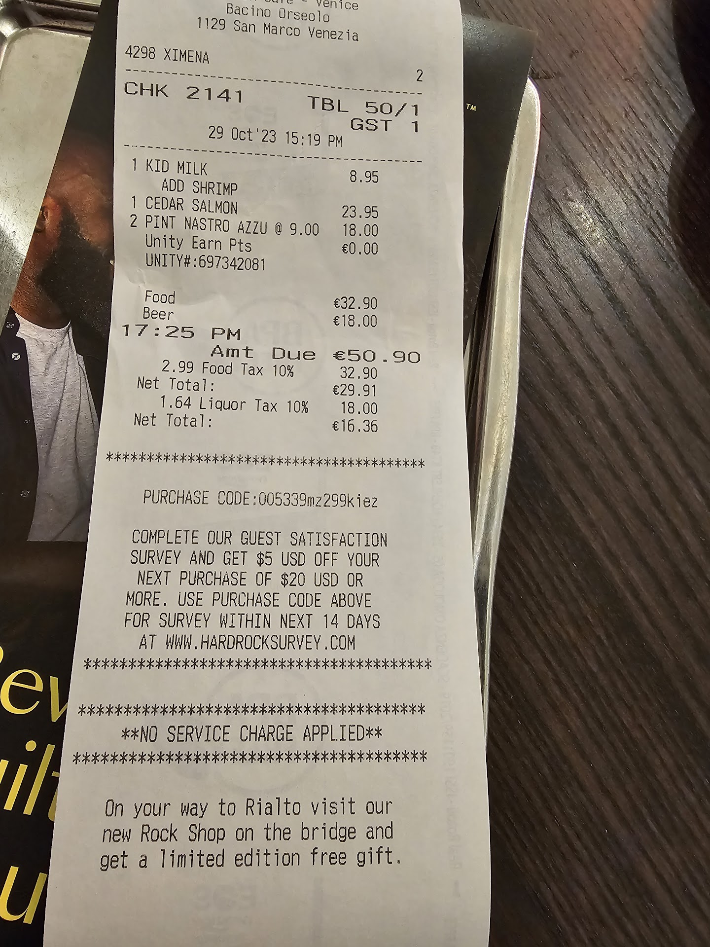 Read moreThank you Fady at the Rock Shop for the assertiveness, you were really friendly and helpful. Okay the Bengali and philipino chefs should answer this, even if it is medium rare, at least the butter on the top should melt if the stake is Hot, what I received was utterly cold and had to request d server to change it. I'm glad she did (sorry the name on the bill says Ximena). Guys I spent 55 euros, the least I deserve is hot food. I'm not taking a dig on the chefs nationality here but professionalism comes with discipline and that's lacking. See photos for the proof, first photo is when I got the food and second one is 15 minutes down but the butter is as is. Also, since when we decided to put brocoli as a bunch and not flowerettes with d stake? Also, when I asked for sauce, I'm served with Worcestershire sauce, like really? This proves the chefs have fake degree. Was very disappointed at this. Finally my order was changed to Salmon, which was great but came with a lime that had no juice. Guys, I'm a Hard Core HR fan please get your act together, realise that irrespective of your nationality, you carry the responsibility of an...