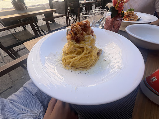 Service was very slow and poorly organized. Our waiter was not Italian, and although trying his best, he kept bringing things late or incorrectly. He served white wine instead of red, then changed it, but every step felt chaotic. The smallest bottle of water cost €6 – clearly filled from the tap.