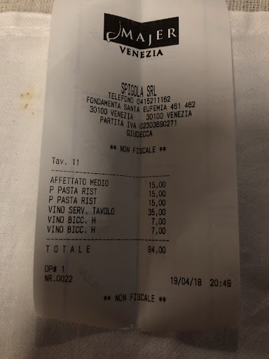 Let´s talk about MAJER Venezia @Giudecca. We went there to enjoy a nice, good and tasty dinner in 2. We came in and fist of all where „welcomed“ by not really motivated waitresses. Seems like they would have liked if we turned around and left. Anyway, we got a table for 2, so small that it could not rather accommodate for one person. But leaving this out we ordered a plate „Big verdure Mix Grill“, a „Hamburger Grill of guinea fowl meat“ and some drinks. We have been pretty surprised that the „big" vegetable plate - at the cost of 20 EUR!! was consisting of 9 pieces of veggie - 2 asparagus, 2 slices of zucchini, 1 quarter of a fennel and and 4 slices of eggplant. REALLY? 20 EUR for this? Incredible and unbelievable calling this a big plate…. Ridiculous. Then the burger. Not made of beef, but anyway came rare. Worst was that it was not only rare but still cold inside. So called the waitress, she very unwillingly took it and said she will re order one. Ask yourself what the result of this was - we got a cold rare burger again - unbelievable. What is so difficult to understand that 1. Fowl is NEVER medium or rare, 2. If the client requests it to be well done you do it well done. It all ended that we left, paid a fortune for nothing and went to a small nice trattoria a local recommended to us as we where really upset after leaving. All in all a complete disaster and def. a never go back...
