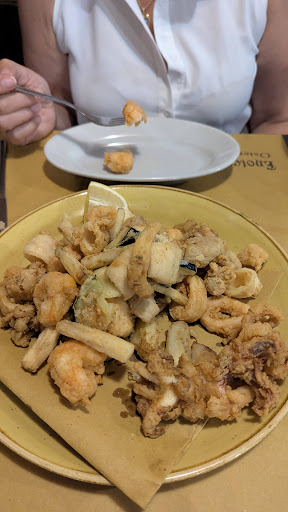 The Food: I ordered assorted pickled fish, called "saor" (photo). Three kinds of seafood (sardine, shrimp, and cod) deep fried and pickled in vinegar. As we have a similar dish in my culture (Japanese), I absolutely loved it. I can imagine saor to be too exotic for some people, but it was my best meal in Venice on this trip.