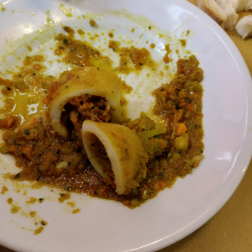 Read moreLocale cupo, poco finestrato, di sera non ci si fa caso, di giorno invece non è il massimo. Personale accogliente e preparato. Cibo davvero poco gustoso. Calamari ripieni di verdure e curry avevano davvero poco gusto, alla masticazione gommosi e di certo non venivano esaltati dal curry che a parer mio stonava. Poi con tutti i buoni ristoranti indiani e Bangladesh che ci sono in città ci manca solo che anche le osterie veneziane si mettano a fare il pesce col curry... Io li ho presi perché a vederli sembravano invitanti. Poi seppie al nero di nuovo con poco sapore nonostante il nero di seppia sia noto per essere molto saporito ed avvolgente. Essendo discretamente esperto di pesce, da pescatore amatoriale nei mesi giusti per la pesca/raccolta ho frigo e congelatore pieni di vongole e seppie, credo che i calamari e le seppie serviti abbiano fatto mesi di congelatore. Tipico del pescato di provenienza dall'indo pacifico. Ed il nero sia quello comprato in vasetto, che, non essendo in purezza ha notoriamente meno gusto. Altrimenti non mi spiego il poco sapore dei piatti, cioè le seppie in nero anche se sbagli temperatura o durata della cottura comunque vengono meglio di quelle che ho mangiato lì. E buttando un'occhiata nella cucina che è parzialmente visibile ho avuto l'impressione che siano cuochi di una buona esperienza e quindi, almeno per i piatti presi (non metto in dubbio che altri piatti siano migliori) l'unica spiegazione è che vadano a risparmiare su certe materie prime comprando roba non solo surgelata ma pure di mediocre qualità. Poi siccome il servizio è buono, sono in centro con una ottima posizione e ci vanno a mangiare anche turisti che non sanno neanche giudicare il cibo seriamente, non stupisce che abbiano un discreto successo. Mi scuso per la foto dei calamari perché avevo già cominciato il piatto quando l'ho fatta. Polenta buona. Consiglio di ridurre il numero di piatti tra cui scegliere ma di lavorare di più con materie...