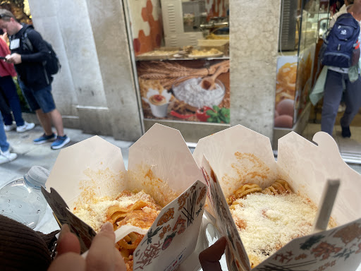 Read moreThe pasta was quite tasty, the portions may have looked a bit small, but you can easily get full by it. Pasta is very fresh, because they make ir right after you order it, and you can even watch how they are making your pasta. There is a daily special, which is a little cheaper than if you take the same thing, but without calling it a daily special. There is an opportunity to choose what type of pasta you want if you don't take the daily special. There are also toppings that you want to put on the pasta, which are up to 1 euro in addition to the price. For the pasta that is in the photograph, 7.5 + 0.5 for extra cheese was paid. The service was very smooth and relatively fast. You just have to take into account that they give you takeaway food and that in Venice there are some problems with finding a place to eat, especially during the hot summer hours. But in the cafe itself there is a table available where you can stand, but you have to know that there is quite a bit of space and that it may not be the best choice if you go during the most...