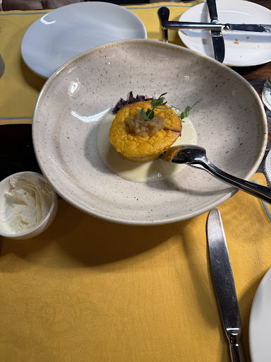 Famished like ravenous beasts, we eagerly dove into the menu. The local wine, the server's recommendation, proved to be an excellent choice, perfectly complementing our meal. The risotto was truly outstanding, surpassing any we had tasted in Rome or Florence. The pumpkin appetizer was equally delightful, bursting with flavor despite its simple ingredients. Even the kids' pasta, made with basic ingredients, was cooked to perfection. To cap off the incredible experience, we savored a delectable tiramisu.