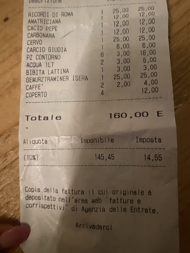 Abbiamo preso le 3 tartare come antipasto; bis primi carbonara e gnocchetti al tartufo con guanciale e pecorino ; una tagliata di Wayu e una di Chianina; amaro; ananas; acqua; 1 bottiglie di Sciraz (in totale 147€).