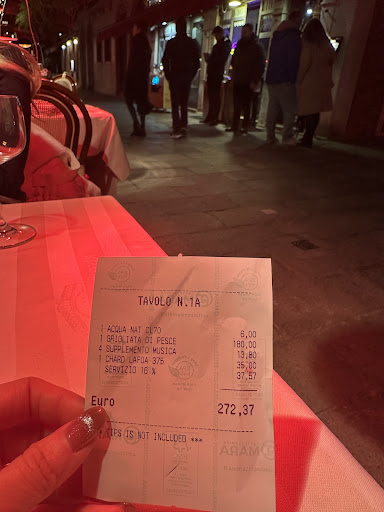 In total, our bill was €273, which included an additional €50 for the music playing inside the restaurant( for each of us and we đi not request for any music)—even though we were sitting outside—along with a 16% service fee. This service fee is not standard in Venice and was completely hidden; it was not mentioned to us beforehand.