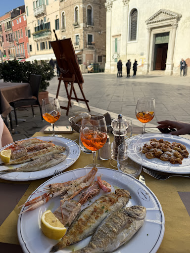 Waaayyyyy too over priced for what could at best be described as an average meal. Scollops were far too small and should not have been served to a customer. The caprese was a joke for 13 euros. We got almost exactly the same quality a few doors down for 7 Euros. The 2 mains that we also had were a joke 20 Euros for 6 scampi, no accompaniments. Wine was the saving grace of the restaurant. Terrible service, as per previous reviews they were far too full of themselves believing that they have the best seafood restaurant in Venice......they don't. So......if you read this and still eat there.... don't say I didn't warn you!!! 😠😠😠😠 101 Euros...