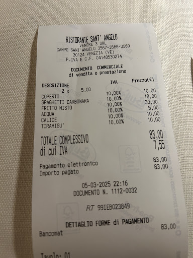 Right after our journey from visiting The Teatro La Fenice (which was amazing, too), we, a group of five, went to this restaurant. I have done a research about lot of restaurants in Venice, and this one is in our top list to-try. When we arrive, the area outside was already full, but we prefer to have the lunch inside anyway. Luckily, we got a table. the person, who welcome us, I think, is the manager (if not the owner) was very friendly and very welcoming. We were excited to try some food already. Just as us ordering the food, another 4 tables next to us had filled with people already. Now into the food; we ordered Seafood Risotto, Seafood Spaghetti (Frutti di Mare), Catch of the day grilled fish (sea bass), Bacon Carbonara. We didn't regret to have a minimum order of two Seafood Risotto, it was excellent. One of the best food, we had in Venice. Not fishy at all, a very savory taste, plumpy mussels, fork tender calamari, fresh shrimp, oh my my, I can't explain it anymore as I am drooling again when I'm typing this. The Spaghetti Frutti di Mare is my favorite, too. I've been trying some frutti di mare dishes around Venice, and I have now two favorite restaurants in Venice to have it, and Sant'Angelo is definitely one of them. It is not fishy at all, a bit stronger salty taste than any other common pasta dish in a good way, it brings up the savory taste, too. It has less tomato-y taste than my other fav restaurant (of spaghetti frutti di mare) which I was a bit skeptical about it when I see the color, but once I bite it, oh boy, it just blows my mind: it was that amazing! And for Frutti di Mare, spaghetti is a must (not linguini, not spaghettoni nor others). Spaghetti is the best pairing in pasta dish for frutti di mare. And this place just nailed it! And again, the quality of the seafood was very very excellent, it was fork tender and plumpy and so fresh. The grilled sea bass (catch of the day) was great, too. it was tender, definitely not fishy at all, it has that aroma of a bit burnt grilled (not burnt at all; just a pleasant smell of grilled fish) which brings up the flavor of the fish. And finally, the bacon carbonara is really really using caramelized bacon, so it has that savory smell and taste on the bacon. Perfect tenderness and size of the bacon. It was still juicy (not too dry), and the juice mixed up with the carbonara pasta was the perfect pair. The carbonara was not too liquid-y, so it needs the juice from the bacon. The egg and cheese flavor on the carbonara is on point (no gimmick at all). It was not too creamy, I think they are using real egg yolk on the sauce, i felt that it was so authentic on my end. last but not least, we still ordered the tiramisu, and wow, i think the hype from the other reviews about it are real. The tiramisu is not too sweet (it is just nice and i think it is what the original tiramisu should taste like). I can taste the creamy marcarpone cheese with the cheese flavor (because other place's Tiramisu sometime taste too bland, but definitely not on this place). The rum soaked lady finger is perfectly tucked in into the marcarpone cheese. And the coffe powder on top is the icing on the cake: a perfect bitterness of coffee to balance the flavor. Overall, everything were very very much lovely and delicious (which is rare in my opinion from one place restaurant in venice to have everything perfect). Kudos Sant'Angelo. I have saved in my google map, if in the future I visit Venice, i will definitely visit you again! Pls keep the standard by then! Thank you for making our lunch memorable and making our Venice experience great! Great and friendly staff too!...