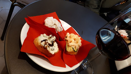 The cicchetti weren't so innovative, but fresh and tasty. One with lard, one with Shrimp and one with Blue Cheese and Balsamico. The red wine here wasn't cheap, but very good. Got some good choice of wine here. Service was - especially for this busy location - very friendly.