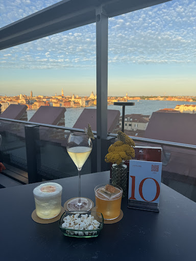 Nice rooftop bar, the main section has a great view over the city of Venice and the back part has a direct view of the sunset. The section overlooking the city has 10 tables next to the edge and can be in demand as you would expect. Staff were warm and welcoming upon arrival l.