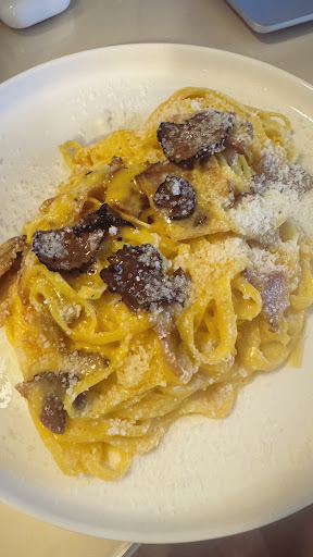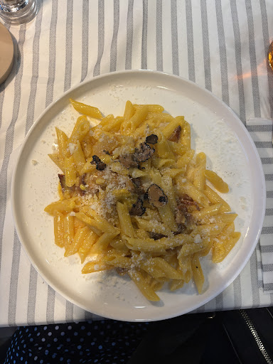 Never been a fan of Pasta dishes, but decided to try one, the restaurants looks posh and has a good ambience, decorated well. We got served straight away. None of the dishes appealed to me as I really wanted fish that day, I ordered the Carbonara without the ham, it was good that they allowed that but if you take an ingredient out is it wrong to ask to replace it with something else, anything... but they couldnt do that. I think the waiter forgot the black truffle, but the main waiter spotted it and added it. Now I dont know what Carbonara is supposed to be like or taste like, but in terms of my view, it was too dry, and was a stuck together stodge on a big plate. Is it meant to be that dry and stuck together, i dont know, but after I ate half of it was a drag eating the rest..would be better with some side sauce to accompany it. We also ordered baked vegetables, to be honest i wasnt impressed, it had some thing that looked like a mini octopus so had to confirm it as only vegetables, it also seemed impossible to cut and eat so I just lett it. The other veg was just average, theres wasnt any large tomatoes or cherry tomatoes which i was expecting, if you like slimy veg you will like this, not slimy as in bad but in terms of texture. Service was fast enough. Just lots of staff rushing and brushing past you while you eat which I didnt like. I didnt like the olive oil taste at all, ive had olive and this was far too concentrated and different taste. We were given three pieces of bread before our meal arrived and we were confused as to what to do with it.... so I just ate it dry which seemed weird. But we found out later we were charged 4 euros for it, even though we didnt ask for it.. I think this is wrong... 4 euros for bread pieces...