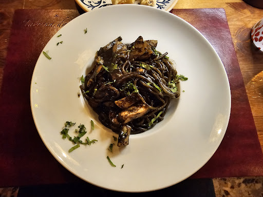 We got bread to start (complimentary) and the baccala (creamed codfish) which was purported to be a local specialty. It came on top of polenta and was a light appetizer. I had the tagliatelle nere which was a super interesting pasta that I really enjoyed (it had pistachios and squid ink). The spaghetti alla busara was a red pasta and my sister enjoyed it. The squid ink pasta is another solid choice. My dad really enjoyed the Venetian style liver (fegata alla Veneziana) if you’re looking for something heartier (it comes with polenta). We had a round of limoncello to finish off our dinner, and it was served in very pretty...