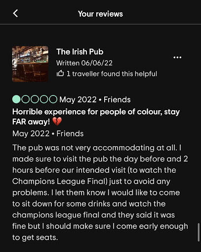Two people next to us had move and I went to sit where they were sitting and the manager came in and shouted “I didn’t tell you to sit there”. I was confused because that’s no way to speak to customer, regardless, I got up and moved. As I moved, the manager muttered “how many iced teas do you want”. Whilst all of this we noticed that we were the only ones receiving this kind of treatment. Many people came in after us and yet we were the only ones pressured to buy drinks and received disgusting treatment and I 100% believe it is because we were POC which is unfortunate. It ruined my day because I had the plan of spending the finals in a pub around other football lovers. Instead, I had to leave because I felt so uncomfortable and walked for a good 20-30mins in the thunderstorm to get to the nearest bus back to my hotel. I also ended up...