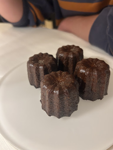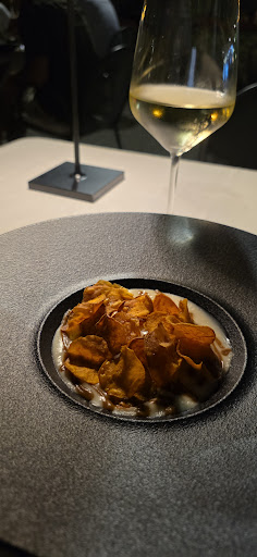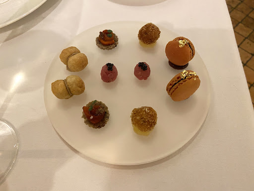 Als Amuse-Bouche bekamen wir kleine, geschmacklich sehr interessante Häppchen serviert und dazu einen hervorragenden Prosecco, worauf der Abend für uns schon gut anfing. In weiterer Folge brachte man uns spezielle hausgemachte Brötchen und feinstes ligurisches Olivenöl zum tunken. Danach gab es eine Art Gazpacho, die raffiniert gewürzt war und nicht auf der Karte stand. In freudiger Erwartung einer weiteren Steigerung wurde dann der erste Gang serviert, ein "Rocher di Vitello", ein Bällchen aus Kalbfilet, begleitet vom 2,Wein, einem Verduno Pelaverga 2019 von San Biago, welcher eine gute Wahl war. Das Rocher di Vitello war geschmacklich interessant, aber auf einem Schoko-Spiegel mit süssen krokantbrösel serviert, was uns leider nicht gerade begeistert hatte. Umso erfreulicher ging es dann aber mit dem 2.Gang weiter, dem “Battuta di Fassona”, einem Tartar vom Fassona-Rind, wozu eine bläuliche Flüssigkeit aus Blütenextrakt serviert wurde, was optisch ein Highligt war. Das Tartar war von bester Qualität und mit Sardellen und dehydriertem Kaviar raffiniert dekoriert und geschmacklich ein kleines Highlight. Der nächste Gang “Ravioli di gallina nostra” , mit Huhn gefüllte Ravioli in einem Sugo aus Zwiebel, Safran und Pistazien war interessant und raffiniert, aber für unser Empfinden leider wieder zu süss. Wir hofften nun, dass der nächste Gang, das Lamm in Heu, das Highlight würde, wozu ein schöner Nebbiolo von La Capuccina eingeschenkt wurde. Das Gericht sah optisch sehr gut aus, und das Lammfilet in einer speziellen Kruste optimal gegart. Die Sauce dazu war leider schon wieder überwiegend eine Schokosauce mit Haselnüssen und Mispeln, was den süssen Trend des Menüs unserer Meinung nach nun auf die Spitze trieb und für uns daher grenzwertig war, weil die Sauce auch Raffinesse vermissen ließ, Das Pre-Dessert war weisse Schokomousse in einem Krokantreigen und dazu gab es einen hervorragenden Süsswein von Guerrieri. Dieses Pre-Dessert war ein gewisses Highlight, obwohl wir von Süsse inzwischen genug hatten. Das Hauptdessert “Erinnerung an den Urlaub” war optisch sehr nett angerichtet, geschmacklich dann allerdings leider noch eine weitere Steigerung in Süsse.