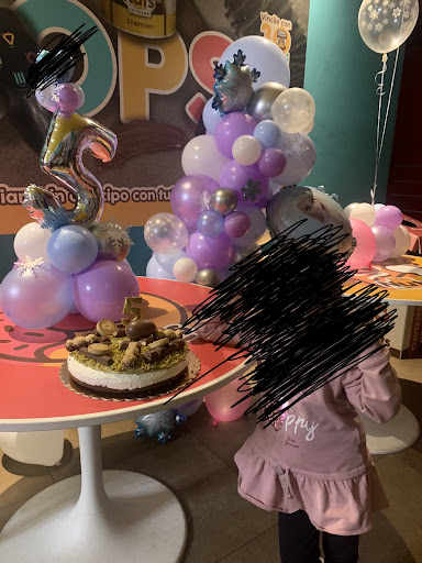 Per il compleanno di mia figlia ci siamo affidati a questo nuovo locale che si dimostra dinamico e molto molto goloso fin da subito sui social. Al telefono parlo con la proprietaria che si dimostra molto molto cordiale. Definiamo i costi: Aperitivo a buffet + bevuta( non specificata) 8€ x gli adulti Aperitivo a buffet + bevuta ( bibita) 7€ x i bambini Arriviamo e troviamo un tavolino rotondo veramente ridicolo con un paio di pizzette surgelate, due ciotole di patatine confezionate, un paio di salatini classici surgelati, due olive, e due olive ascolane che non abbiamo neanche toccato perché già solo guardarle lasciavano desiderare, due toast a pezzi microscopici e basta. Arriva probabilmente il padre o comunque un parente dei proprietari e ci chiede se gradiamo del vino secco o dolce. Chiedendo agli invitati che rispondo il vino che gradisco. Senza neanche chiedere a me e senza far in tempo a chiedere se era compreso nel prezzo pattuito apre la bottiglia. Sorvolo pensando fosse la bevuta compresa del prezzo. Chiedo 2 volte il bere dei bimbi che arriva a metà serata. Senza cannucce ne bicchieri ma in bottigliette di vetro facciamo osservazione ma nessuno ci ascolta. berranno a canna. Ci lamentiamo del cibo, portano una milanese a pezzo orribile e un tagliere di salumi.. devo dire molto buono. Ne una bottiglia d’acqua, ne una posata..nulla. Ci danno fretta perché per aspettare il cibo l’orario di chiusura era passato. Escono con due torte enormi. Due. Quando eravamo in 7 persone + 3 bambini la proprietaria aveva consigliato di prendere due torte non 1 perché non bastava…risultato due torte pagate 35€ l’una. Una che ho dovuto portare a casa intatta. L’altra a metà mi sono rifiutata di portarla..torte ne buone ne terribili..ma sicuramente non buone. Arrivo in cassa. Mi dicono che la consumazione del bere non prevede le bottiglie. Di conseguenza dovevo pagare gli 8€ pattuito più le bottiglie a parte perché non erano comprese negli 8€ senza però aver consumato effettivamente il bere gratuito a questo punto. Mi spiegano che da che mondo è mondo le bottiglie si pagano a parte mentre le consumazioni sono o un alcolico o una bibita. Scioccata dico che noi non abbiamo chiesto nulla. Ma che il signore ha chiesto agli ospiti che vino volessero senza chiedere a me e senza specificare il costo non compreso nel “pacchetto” Risultato 300€ di compleanno peggio spesi in vita mia. Locale sporco, bagni sporchi. L’unica cosa che si salva è la zona giochi i bimbi si divertono perché loro per fortuna non capiscono quando vengono presi in giro. Io invece mi sono accorta di essere stata presa per il ** per bene. Mai più. Vergognosi. Siete solo bravi a sponsorizzare e a vendervi per quello che non siete Spiace perché potevate essere l’eccezione per Vercelli, ormai paese senza speranza. Ah i palloncini stupendi non li hanno messi loro ma una ragazza esterna..bravissima . Altra cosa. Ci hanno chiuso dentro al locale appena siamo scesi dal piano sopra. E ci hanno aperto solo dopo che siamo andati in cassa per pagare e dopo che ho appunto fatto notare che eravamo chiusi dentro. Bho. Non...