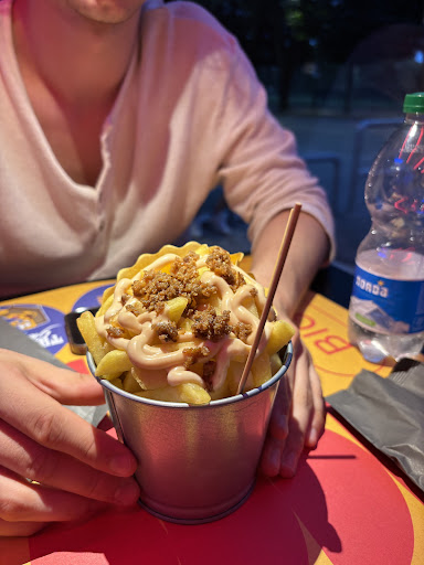 Prezzo: a mio parere un po' alto per quello che offre (pur comprendendo il periodo attuale), soprattutto i 2.50€ di coperto che non ho mai visto in locali simili, considerando che tramezzini o hamburger si mangiano con le mani e le patatine avevano lo stecchino di legno. Non ho capito poi come mai abbia pagato 5.50€ le patatine grandi quando sul menù fattomi vedere poco prima era segnato 5€ (mi viene il dubbio che fossero 0.50€ di salsa che non ho mai chiesto e non mi è mai stata data).