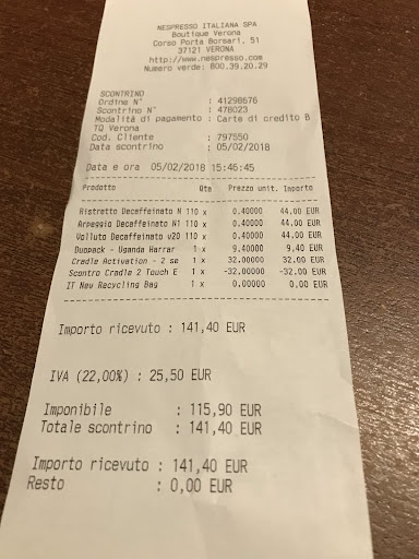 Read moreMesi fa sono stato in questa boutique per la mia prima fornitura di caffè dopo l’acquisto della macchina. Nonostante fosse la mia prima volta non sono stato accompagnato in sala degustazione se non dopo averlo chiesto io, ma non sapendo ancora come funzionasse in Nespresso ho pensato fosse così. Ho acquistato del caffè e sono stato invitato a comprarne altre per ottenere un buono da 5€ per l’acquisto successivo. Dopo qualche settimana sono tornato di nuovo in questa boutique, e di nuovo non mi è stata offerta la degustazione e neanche lo sconto dei 5€ (a dire il vero io non ho chiesto né l’uno né l’altro). Per il terzo acquisto sono andati presso una boutique di Roma, e nonostante fosse molto affollata sono stato invitato a degustare il caffè. Ho chiesto delucidazioni circa la degustazione e ora so che viene generalmente sempre offerta, a meno che ci sia molta gente in attesa e a Verona eravamo in pochissimi. Ho scoperto poi che il buono di 5€ non risultava poiché il mio acquisto era stato assegnato al profilo di un mio omonimo. Solo ora che ho più dimestichezza con il mondo Nespresso posso dire di non essermi trovato a mio agio presso quella boutique e di essere stato trattato con sufficienza e che se ho scelto Nespresso non è solo per la qualità del caffè ma anche per il brand e tutto il mondo...