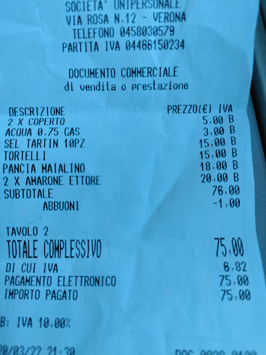 Read moreSi torna sempre dove si è stati bene! Un anno fa io e il mio compagno siamo venuti dal Friuli per una giornata a Verona e cercavamo un posto dove mangiare che fosse tipico, autentico, con piatti tradizionali ben eseguiti e dei buoni vini. Cercando sui social tra vari locali (tanti che sembravano trappole per turisti) abbiamo trovato il Caffè Monte Baldo! Proprio quello che volevamo! Osteria storica, con sala curata nei dettagli (le pareti interamente ricoperte dalle loro bottiglie bellissime da ammirare), personale sorridente, gentile, con sempre una parola amichevole da scambiare con i clienti e in un ultimo ma non per importanza dei piatti spettacolari! Ci siamo tornati pochi giorni fa con amici, anche loro felicissimi dell’esperienza! In entrambe le occasioni abbiamo cominciato con un aperitivo con bollicine e selezione di cicchetti, ottimi tutti gli abbinamenti e con pane delizioso, perfetto per i crostini… Fra i primi abbiamo provato i ravioli fatti in casa con la pasta al vino rosso, molto delicata, e ripieni di coniglio alla cacciatora, tenero e saporito. Ovviamente abbiamo ripreso come la prima volta anche il cavallo di battaglia del ristorante, il piatto per cui facciamo il viaggio, il risotto all’Amarone migliore che ci sia! Espresso, al dente, mantecatura perfetta, gusto vellutato, conserva tutto l’aroma del vino senza risultare stucchevole. Piatto imperdibile del loro menù! Come secondo abbiamo puntato sulla carne, pancia di maialino e guancia di manzo brasata che, come lo stinco dell’anno scorso, erano tenerissime, sapore delle carni eccellente e bilanciato perfettamente con i contorni e i condimenti. Per accompagnare un calice di vino rosso molto buono e corposo. Si vede tutta la passione e la cura che viene messa nel menù, nelle ricette, nell’esecuzione dei piatti e in ogni aspetto del ristorante. Cosa rara al giorno d’oggi. Eravamo seduti in una saletta privata, carinissima, alla fine del pranzo il caffè ce l’ha servito il titolare con cui abbiamo avuto il piacere di scambiare due parole nonostante la sala fosse piena per il ponte del 25 aprile. A quel punto il titolare ci ha offerto un dolce fuori menù, un biscotto all’Amarone fatto da loro con una mousse sempre all’Amarone, per accompagnare ci ha anche offerto un calice di vino bianco passito così buono che sembrava di bere miele, una vera chicca! Al momento del conto oltre alle coccole offerte ci è stato fatto anche un piccolo sconto, come la prima volta, apprezzatissimo! Ammetto che saremmo stati felici anche di pagare tutto per intero perché i prezzi sono onestissimi e è un piacere sostenere le attività che lavorano in questo modo! Complimenti al titolare e a tutto lo staff di sala e cucina! Continuate così! Noi torneremo ancora...